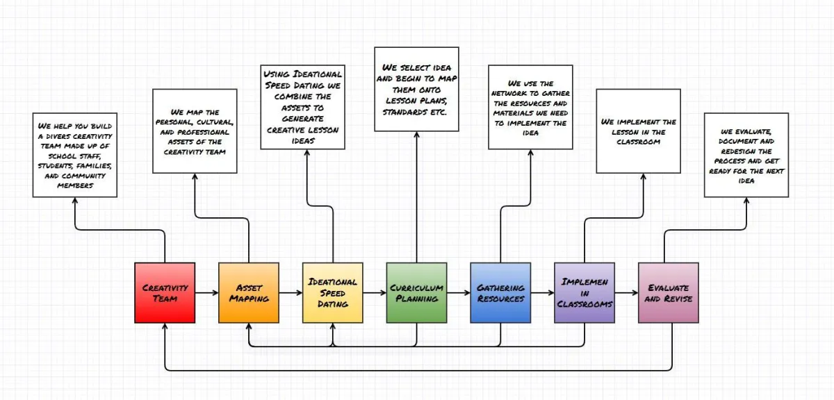 Creativity is not a lightning bolt that shoots down from above. It is an intentional act-- an openness to experience and possibility, and a willingness to explore and imagine. 3C works with schools to build creativity teams out of people, places, and possibilities that surround schools. Then we help to build curriculum that deepens learning and makes in more engaging